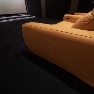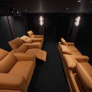 Les fauteuils de cinéma en alcantara couleur caramel, fabriqués en Italie, confèrent à la salle une identité unique. Ils apportent une signature forte et distinctive au design général de ce cinéma privé, renforçant son caractère exclusif.